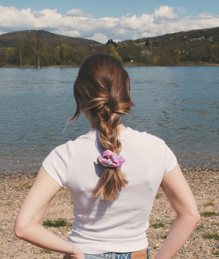 Unsere Scrunchie Kollektion wird aus hochwertigen Vintage Stoffen hergestellt, die zu neuem Leben erweckt werden. Durch die Verarbeitung überschüssiger Stoffe sind diese Haargummis nachhaltige und modische Alltagsbegleiter. Sie sind einzigartig und in begrenzter Stückzahl erhältlich. Das Nähgarn wird aus Bio-Baumwolle hergestellt. Das von uns verwendete Gummiband besteht ebenfalls aus zertifizierter Bio-Baumwolle und Naturkautschuk und ist somit absolut ökologisch abbaubar, vegan, plastikfrei und hat eine längere Lebensdauer als herkömmliche Gummibänder.
